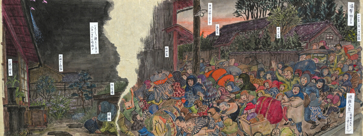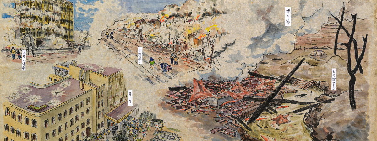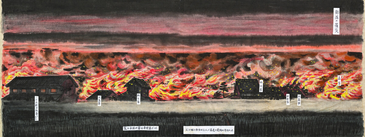 富山大空襲を体験した人々が、自らの記憶をもとに描いた絵を展示します。被災の瞬間や逃げ惑う情景、焼け跡に立ちすくむ人々の姿など、当時の目で見た光景を通して、戦禍の現実と平和の尊さを静かに伝えます。