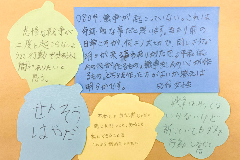 来場者が未来への思いを綴る「平和のメッセージボード」を設置して戦争を知らない世代が記憶と向き合い、平和の大切さを考える場をつくります。